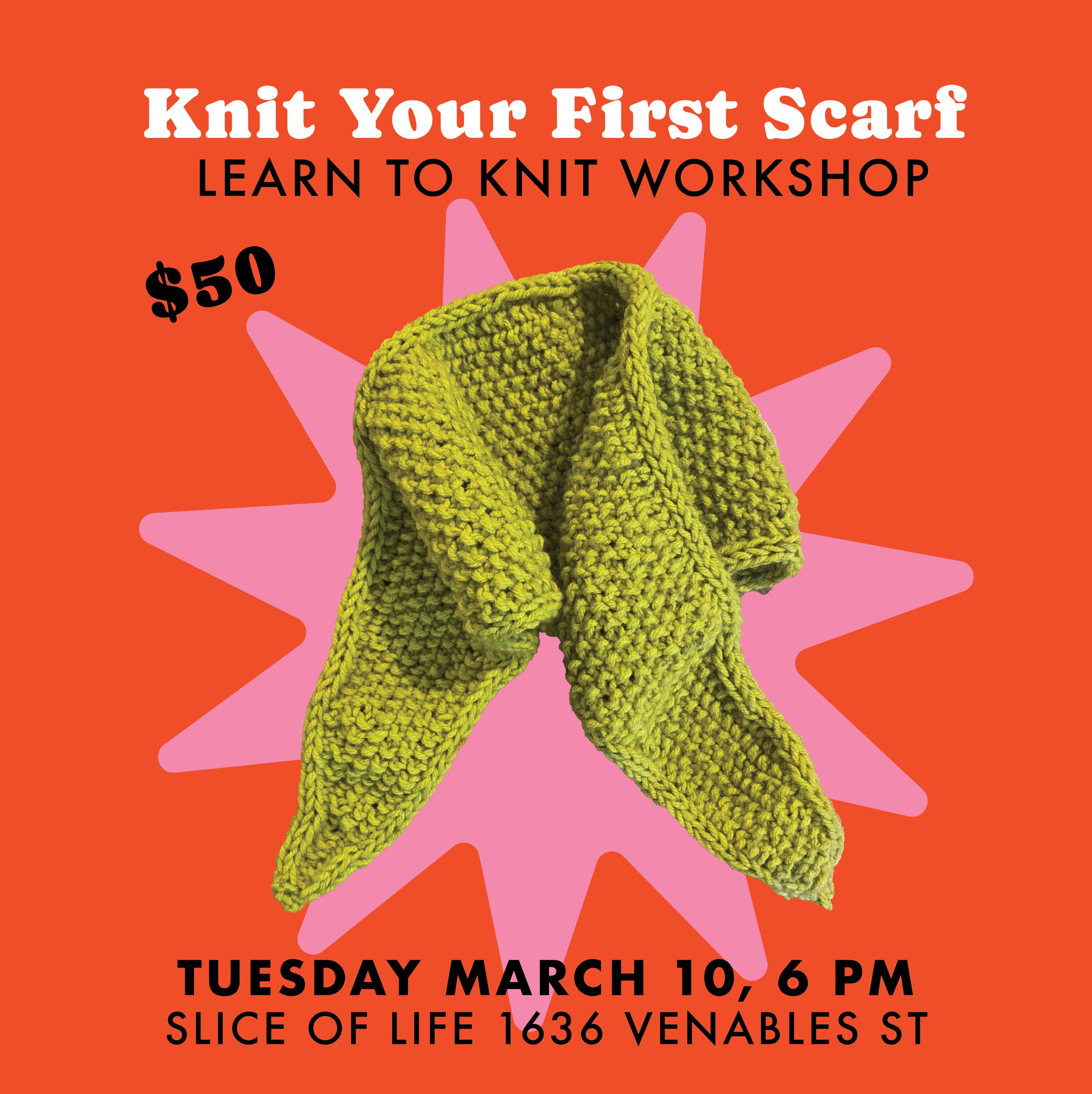 Learn to knit your first scarf! In this class you will learn to caston, cast off, knit and purl. This workshop includes knitting needles and yarn to take home.